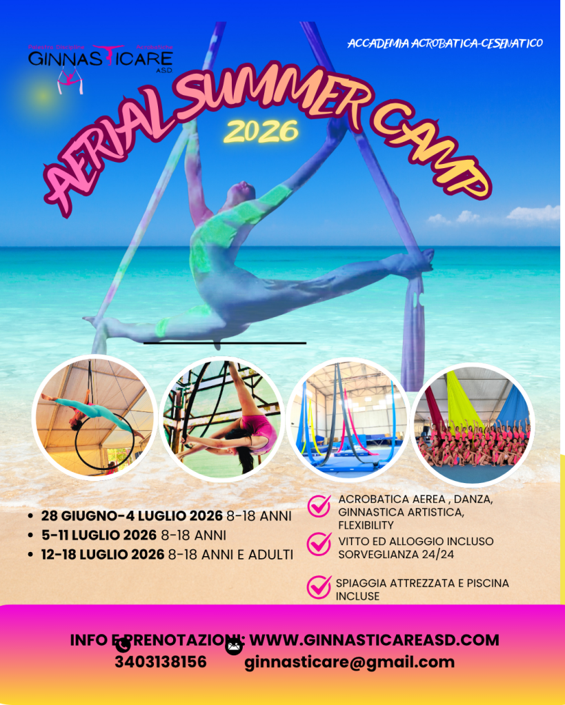 PROGRAMMA: 7 giorni, 6 notti presso l’Accademia acrobatica di Cesenatico. Arrivo domenica, dal lunedi al venerdi doppio allenamento, mattina e pomeriggio, partenza sabato mattina. Gli allenamenti si alternano tra acrobatica aerea, ginnastica artistica, acrobatica, danza, contorsionismo. Sono presenti tecnici federali della Federazione ginnastica d’Italia ed istruttori qualificati di acrobatica aerea.