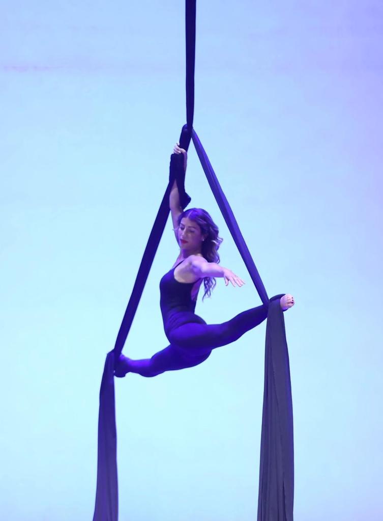 Ciao, mi presento. Sono Roberta Coccarello e ho una passione infinita per i tessuti aerei. Fin da piccola ho amato la danza e la ginnastica ritmica, discipline che ho praticato per parecchi anni. Il cielo mi ha sempre richiamato molto, ma soffro di vertigini. Quindi, qualche anno fa, sono andata a una lezione di prova di tessuti aerei, un po’ per gioco, un po’ perché ne sono sempre stata affascinata, un po’ per vedere cosa succedeva con le mie vertigini. I tessuti sono immediatamente entrati nel mio cuore e, anche se il periodo covid ci ha messo a dura prova, non ci siamo mai abbandonati. Mi sono messa in gioco partecipando a diverse esibizioni e ho partecipato nel 2022 al Campionato Csen classificandomi Prima al regionale e Quarta al nazionale a